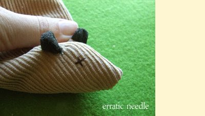 5. Para fechar a abertura use o cordão para a cauda do rato. Cole as orelhas e os olhos.